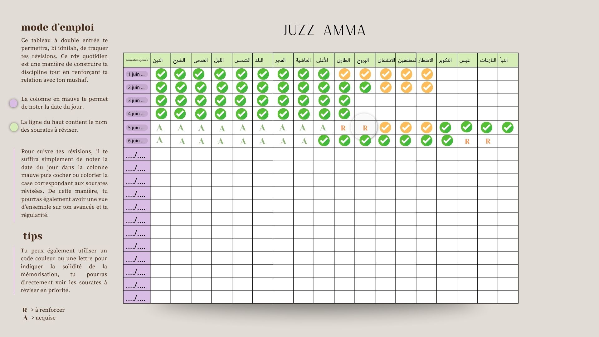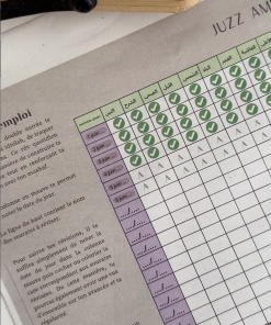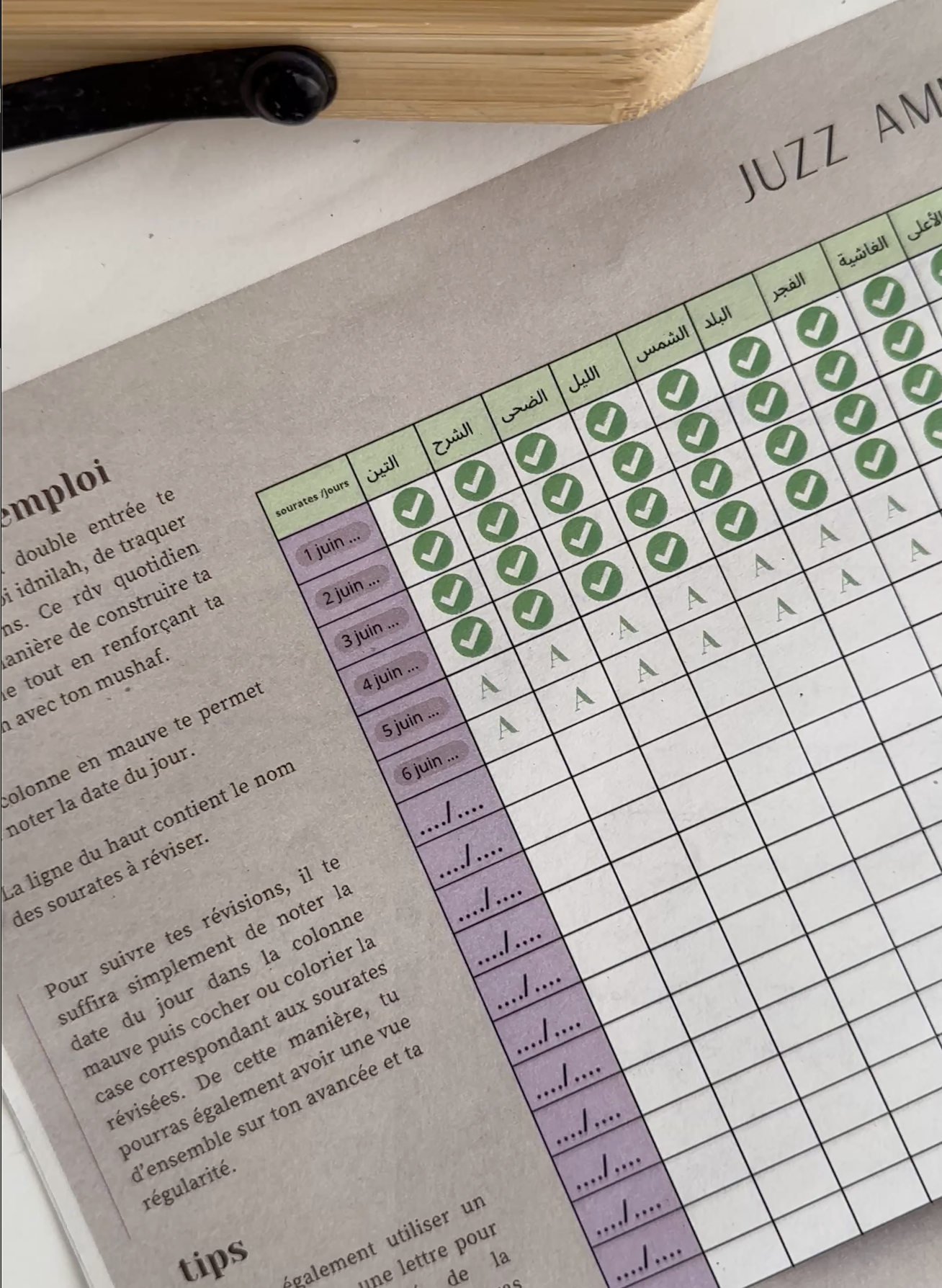 Chaque fois que tu révise une sourate, note-le dans le tableau prévu à cet effet. Visualise ta progression, identifie les sourates à renforcer et garde une trace concrète de tes efforts. Ce support te permettra d’instaurer une routine claire et motivante, tout en favorisant une révision équilibrée de l’ensemble des sourates déjà mémorisées.